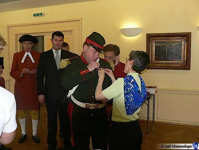 Zünftersfrauen, den persönlichen Gästen helfen, den geeigneten Hut und