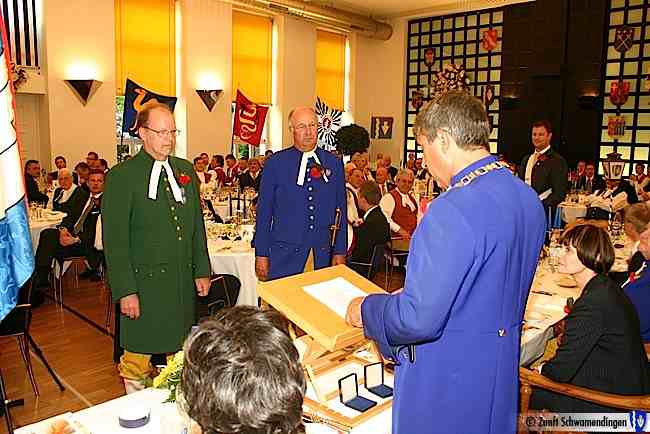 Nach Begrüssung der Gäste durch den Zunftmeister spielt ein Tambour. Hanspeter Hauser (Statthalter) und Oskar Müller (Zeugwart), die anlässlich des vergangenen Hauptbotts als Vorsteher zurückgetreten sind und in Dr. Werner Städeli und Hanspeter Egli würdige Nachfolger gefunden haben, werden durch den Zunftmeister zu Ehrenzünftern ernannt. Er dankt den beiden für den langjährigen Einsatz und die Freundschaft und überreicht ihnen als äusseres Zeichen ein goldenes Zunftabzeichen. Nach Denkesworten durch Hanspeter Hauser verlassen die bisherigen Vorsteher den Vorstehertisch und Hanspeter Egli und Dr. Werner Städeli nehmen deren Plätze ein.
