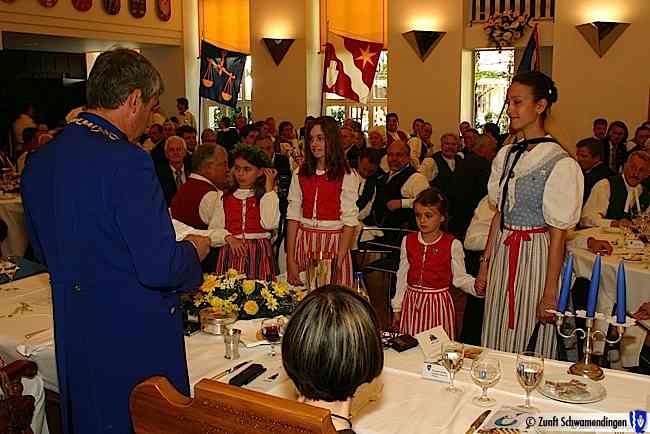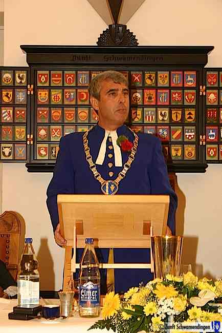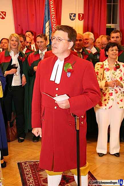 Dann wendet er sich mit einem weiteren Witz an seinen Tischnachbarn, den Ehrenzunftmeister Toni Steiner und schliesst mit einer Einladung an die Vorsteherschaft seine Rede.