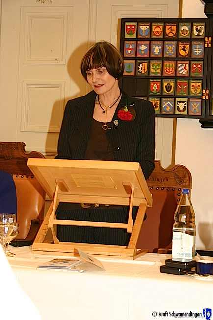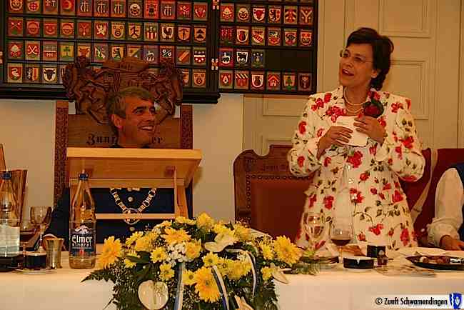 Aus 4 Gründen sei sie gerne zu uns gekommen: 1. haben sie die Schwamendinger noch während dem Wahlkampf zuerst gefragt (es kamen später 4 weitere Anfragen), 2. wurde sie vom Wahlkreis Schwamendingen wirklich gewählt, 3. wegen des Zunftmeisters auf Anraten ihres Gatten und 4. meinte Frau Derren, die Statthalterin der Frauenzunft, Carlo Hächler sei ihr liebster Zunftmeister – „zu dem mues ich“. Die Schwamendinger Zunft sei wirklich frauenfreundlich. Sie wundert sich dann, dass ihr unser Zunftmeister in seiner Vorstellung rote und grüne Markierungen für ihr Ordner-Chaos gegeben hat, sei ihre politische Farbe doch blau. Ob Schwamendingen wirklich den kürzeren gezogen hat, als das Fernsehen nach Oerlikon vergeben wurde, daran zweifelt sie, denn dort werde mehr Güsel produziert als im Heizkraftwerk und den könne sie als Energieministerin gar nicht gebrauchen. Nach einem Statement zur Wahlwerbung „4 +1“ im Regierungsrat geht sie auf die Bemerkung der Bundespräsidentin ein, sie sei nicht gekommen, um der SP in Zürich Ratschläge zu erteilen und meint: sie sei nicht sicher, ob deren Genossen in Zürich ihre Rezepte nicht doch brauchen könnten. Dann äussert sie sich in einigen Vergleichen mit der Bundesrätin und dem Nationalrat zu ihrer Aufgabe als Landwirtschaftsministerin.