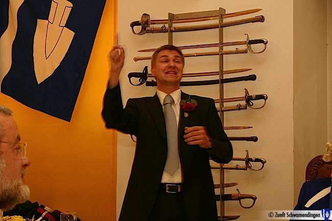 Hat sich sehr gefreut, dass sich der Zunftmeister hat entscheiden können, auch noch einen Mann als Ehrengast einzuladen. Sagt, dass dies vielleicht ein Missverständnis war, genauso wie, als eine älter Dame ihn am Bodensee mit dem Schwingerkönig verwechselte. Er komme aus dem Tal, das Zwingli hervorgebracht hat, Doppelolympiasieger und Weltmeister. Die Idee von Leuten, aus dem schönen Toggenburg einen Naturpark zu machen, hat er sich so vorgestellt, dass er auf dem Land arbeite, etwas weiter weg ein Zaun, hinter dem Leute ihm zusehen und ab und zu eine Banane werfen. Er kritisiert dann in lustigen Worten die Umweltschützer im Toggenburg, die wegen Auerhühnern erfolgreich einen neuen Skilift bekämpften. Inzwischen haben die gleichen Kreise Luchse importiert und nun beklagen sie sich, diese hätten die Auerhühner gefressen. Dann bringt er den Witz über den BR Leuenberger, der ohne Pass an der Grenze aufgehalten wird und beweisen muss, dass er Bundesrat ist. Rainer Maria Salzgeber hätte in der gleichen Lage als Beweis ein Spiel kommentiert, Alex Frei musste mit dem Ball jonglieren und ein Tor schiessen. Da meint Bundesrat Leuenberger mit weinerlicher Stimme: aber ich cha doch nüt. Die Antwort der Zöllner: jawohl sie sind der Bundesrat Leuenberger, sie können passieren. Als Ausgleich bringt er einen Witz über den Bundesrat Blocher, der mit den Töchtern auf den Säntis wanderte. Nach diversem Nachfragen durch die Töchter, wie lange es noch dauere, auf die er immer die Antwort gab: etwa 1 ½ Stunden, hatten die Töchter genug und sagten: aber das hast du doch schon zweimal gesagt. Darauf Bundesrat Blocher: En SVP-ler ändert seine Meinung nie.