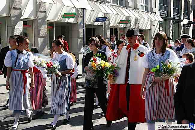 Nach Abschluss der Besuche werden im Glockenhof die Tische wieder aufgebaut und der zweitletzte Teil des Sechseläutens beginnt: Gemütliches Zusammensitzen, austauschen von Erlebnissen des Tages, Bratwurst, Bürli und Bier vom Fass geniessen zum Schluss-Auftritt der Harmonie Schwamendingen. Die Glarner Tambouren aus Näfels mussten uns leider nach dem Nachtessen bereits verlassen. Während der Zunftmeister den offiziellen Teil eines weiteren wunderschönendes Sechseläutens abschliesst und viele Zünfter mit ihren Gästen noch gemütlich zusammensitzen, zieht es den Redaktor zum ersten Saubannerzug des Abends ins Zunfthaus zur Waage, wo der neue Zunftmeister und Gründer der IZV (Jungzünfter-Vereinigung) auf seine Kollegen wartet. In witzigen Worten und im Aufzug eines Saubanner-Alpaufzugs erscheinen all seine Nachfolger in der Funktion als IZV-Präsidenten und lassen das ehrwürdige Zunfthaus unter den Lachsalven der dicht gedrängten Zuhörer-Schar erzittern. Einer der beiden Sprecher, Florian Bigler, ist zu meiner grossen Freude ein Schwamendinger Jungzünfter, ein zukünftiger IZV-Präsident. Dann geht es weiter ins Grüne Glas der Zunft Riesbach, wo 2 ehemalige IZV-Präsidenten, darunter auch unser neuer Schreiber Pascal Pauli Zünfter und Gäste mit ihrer witzigen Rede in Bann ziehen. Mein Blick in die Runde zeigt, dass auch viele Schwamendinger ihre Stube verlassen haben, und den für mich schönsten Teil des Sechseläutens im Kreise von Zünftern anderer Zünfte geniessen. Für die Unermüdlichen geht der Weg dann weiter zum Frühstück in die Zimmerleuten oder ins Kaufleuten.